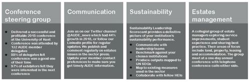 The Association of University Directors of Estates (AUDE) is the representative body for higher education (HE) estates and facilities staff. Its members are the directors of estates and facilities from 171 institutions in the UK, five oversees institutions and alternative providers and three carefully selected business partners. In total, we have over 1200 individual members from across these sectors.